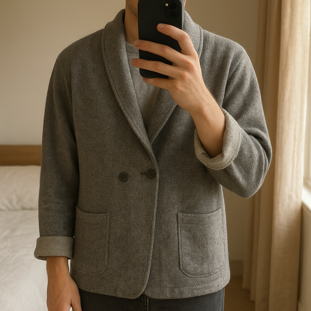 Blazer oversize religion in piedi, rivolto verso la fotocamera, in una camera da letto con luce soffusa e luce naturale che filtra dalla finestra.