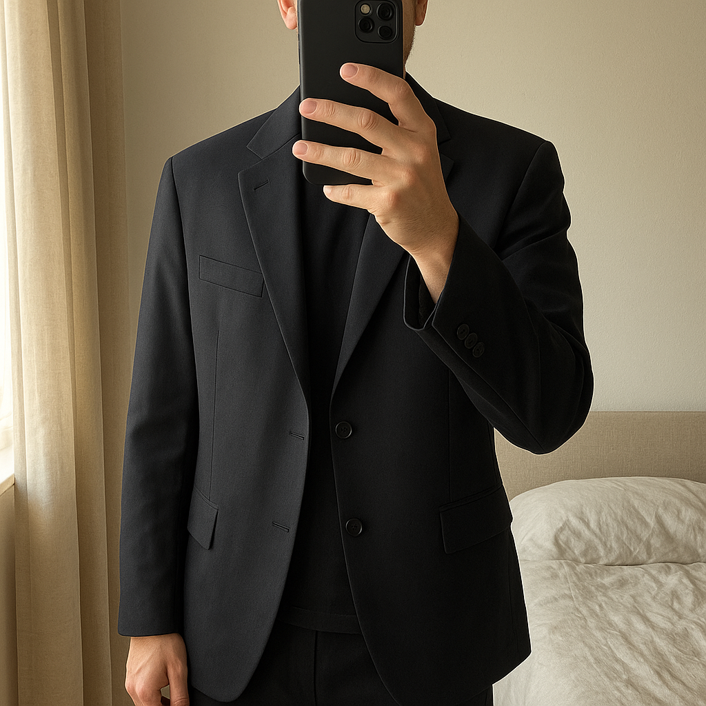 Blazer Stretch Celio Noir Taille 56 debout, face à la caméra, dans une chambre à la lumière douce, avec une lumière naturelle filtrant par la fenêtre.