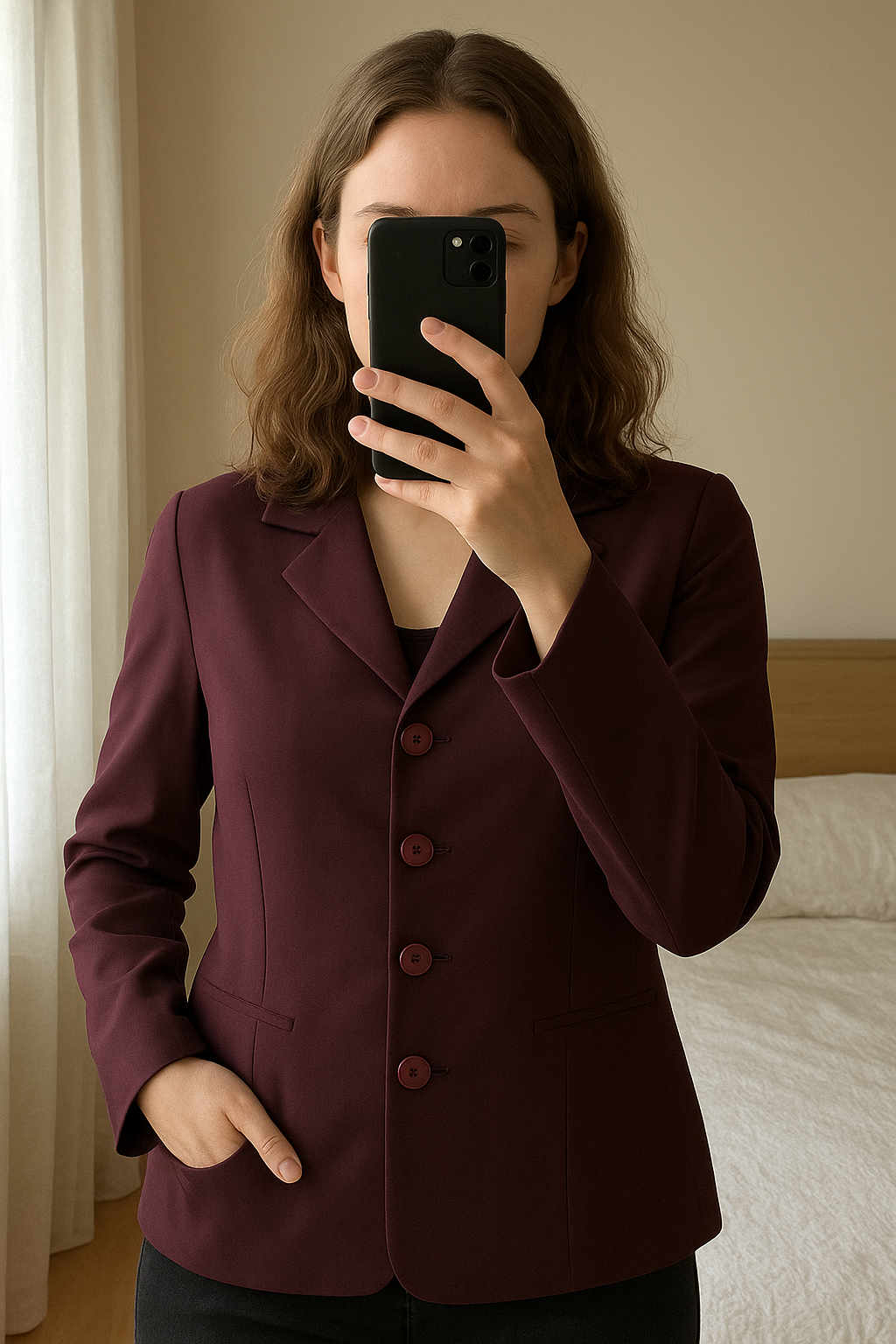 Blazer Violet debout, face à la caméra, dans une chambre à la lumière douce, avec une lumière naturelle filtrant par la fenêtre.