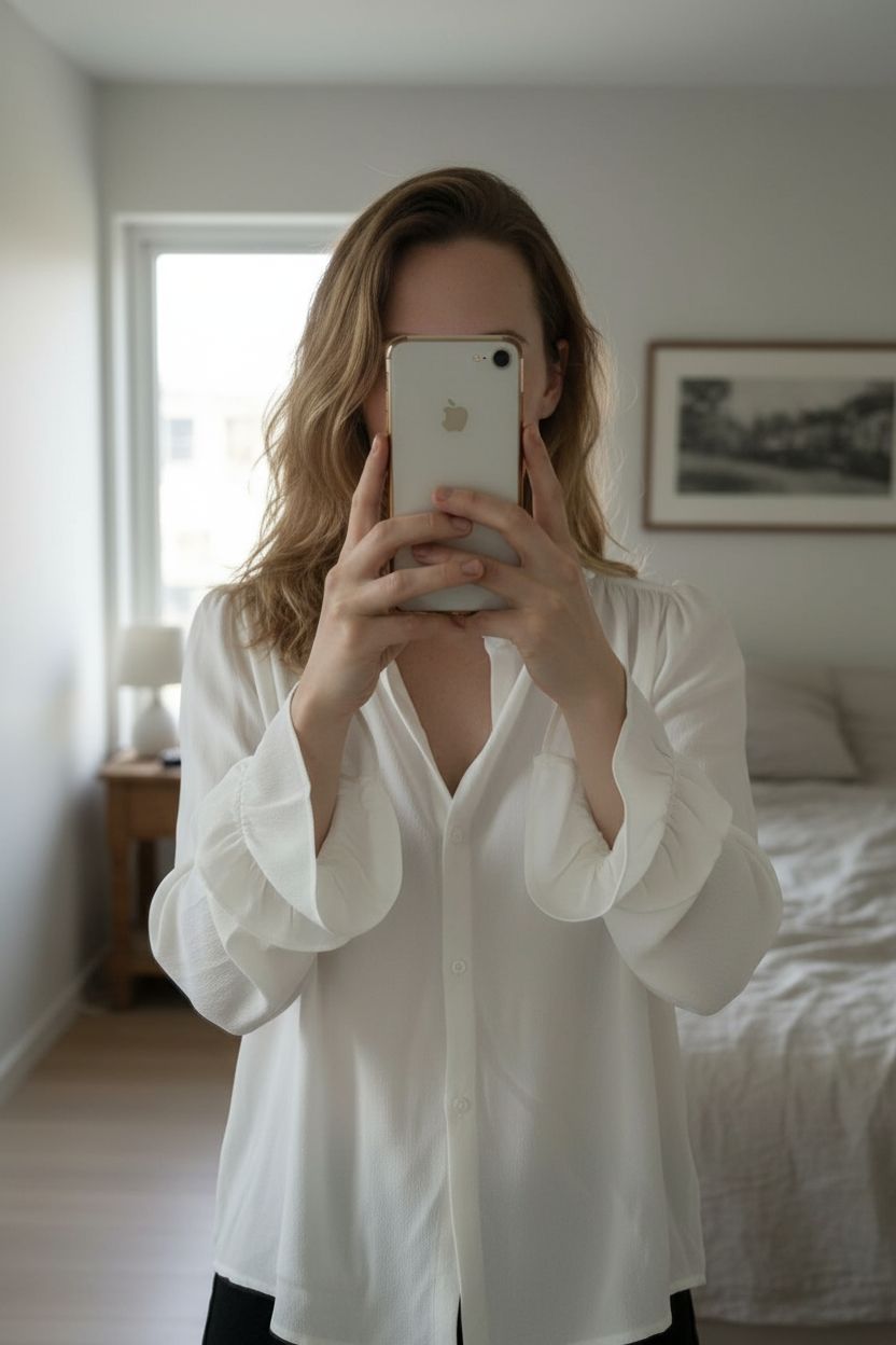 Blouse Bash taille 1 debout, face à la caméra, dans une chambre à la lumière douce, avec une lumière naturelle filtrant par la fenêtre.