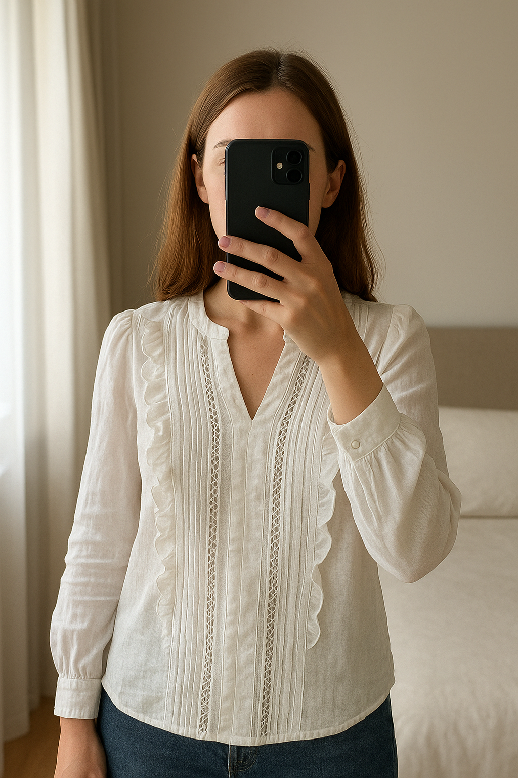 Blouse caroll debout, face à la caméra, dans une chambre à la lumière douce, avec une lumière naturelle filtrant par la fenêtre.
