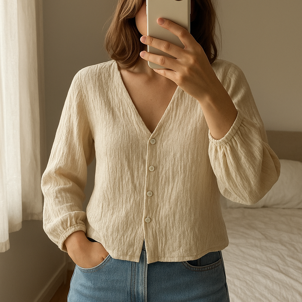 Una persona in Blouse crème Zara S - Maglietta blusa donna Zara inarcando leggermente la schiena per una posa dinamica, in una camera da letto con luce soffusa e luce naturale che filtra dalla finestra.