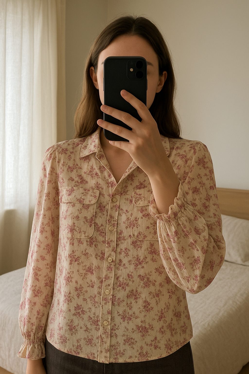 Blouse fleurie debout, face à la caméra, dans une chambre à la lumière douce, avec une lumière naturelle filtrant par la fenêtre.