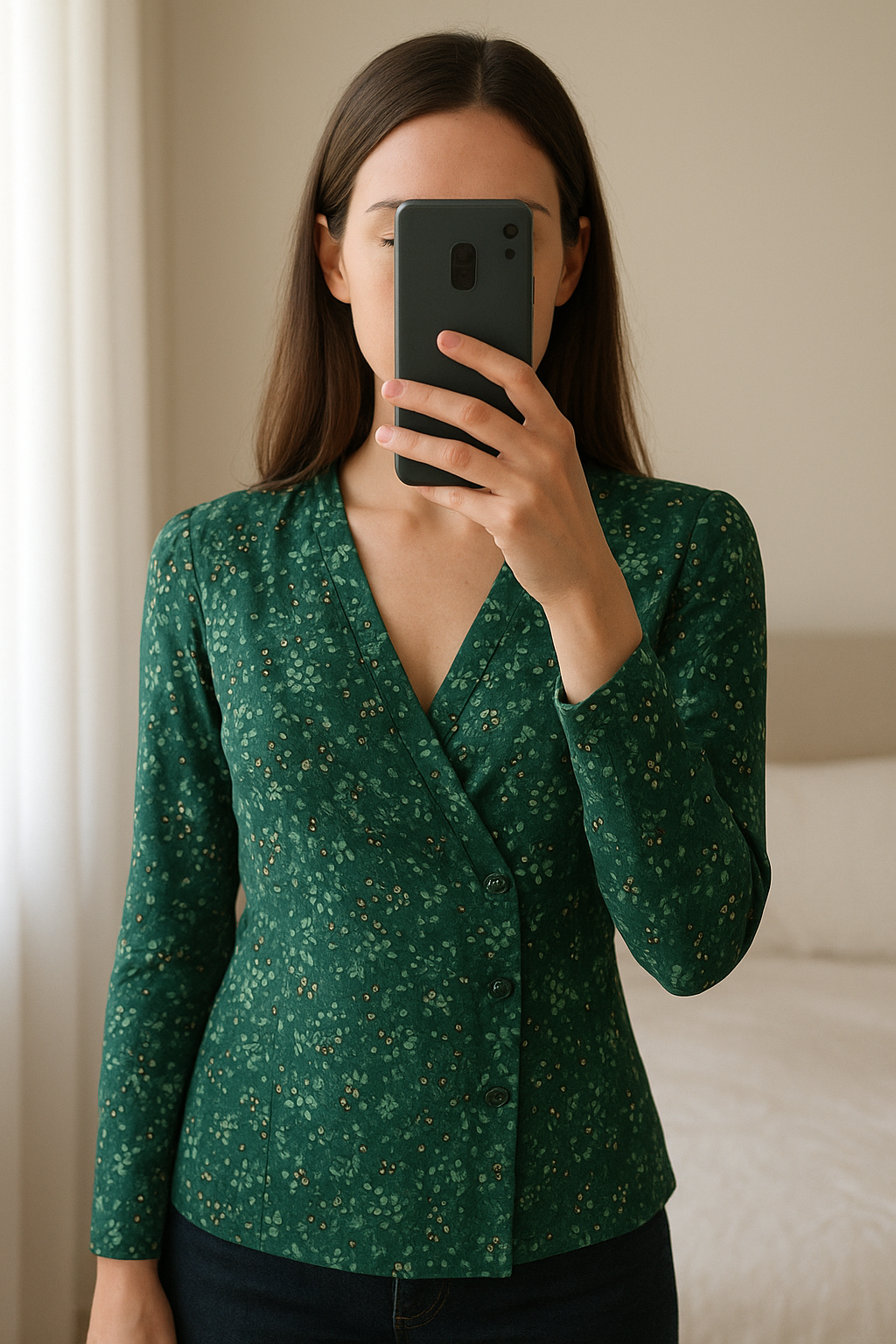 Blouse IKKS verte taille 36 debout, face à la caméra, dans une chambre à la lumière douce, avec une lumière naturelle filtrant par la fenêtre.