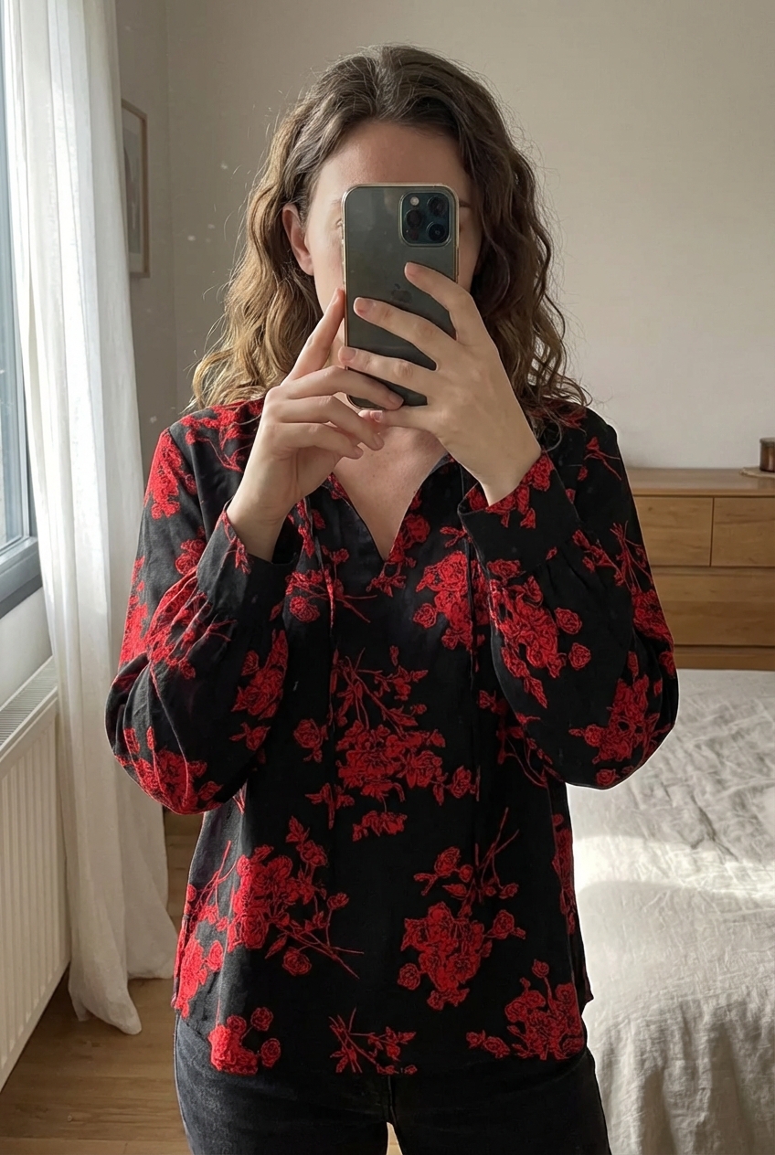 Blouse rouge et noire S debout, face à la caméra, dans une chambre à la lumière douce, avec une lumière naturelle filtrant par la fenêtre.