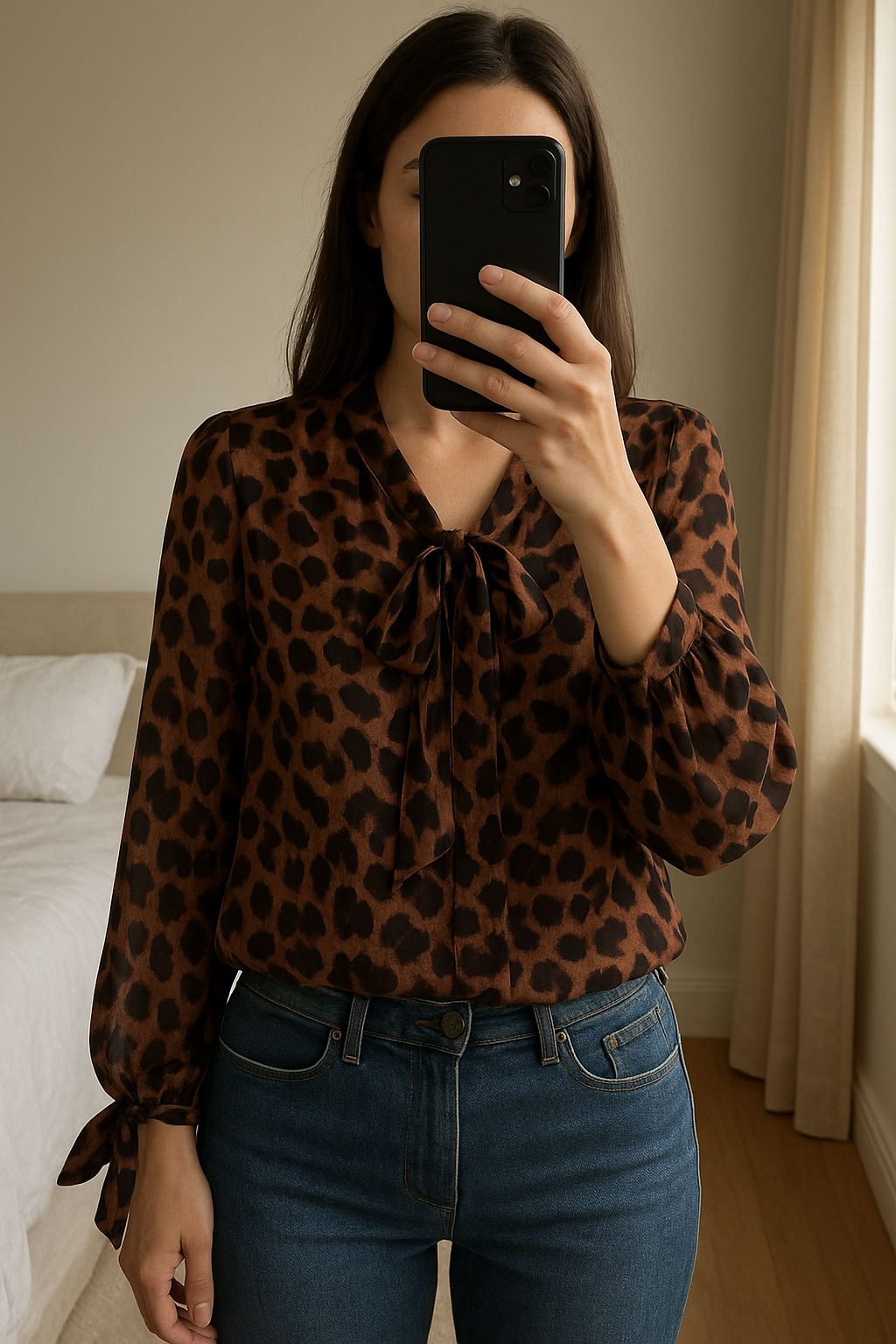 Blouse Shein T34 debout, face à la caméra, dans une chambre à la lumière douce, avec une lumière naturelle filtrant par la fenêtre.