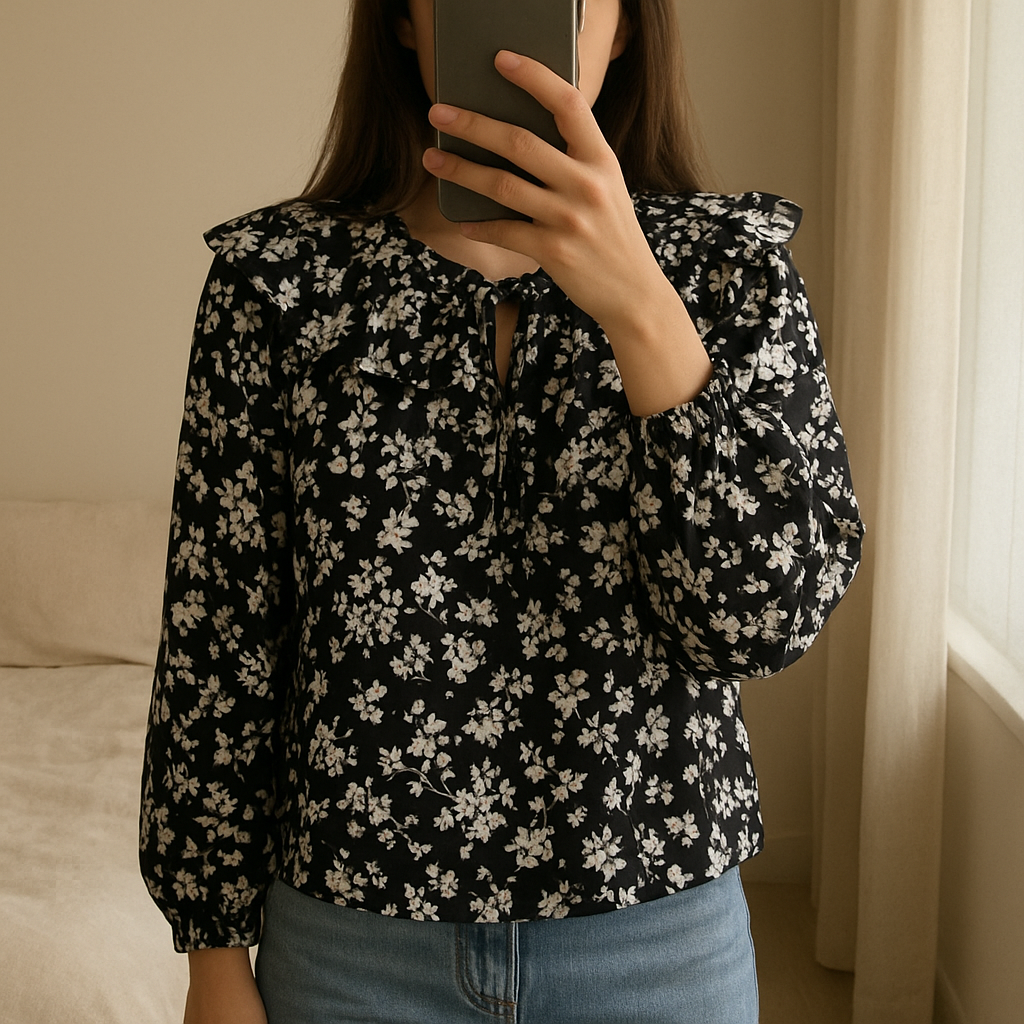 Blouse Zara T34 debout, face à la caméra, dans une chambre à la lumière douce, avec une lumière naturelle filtrant par la fenêtre.