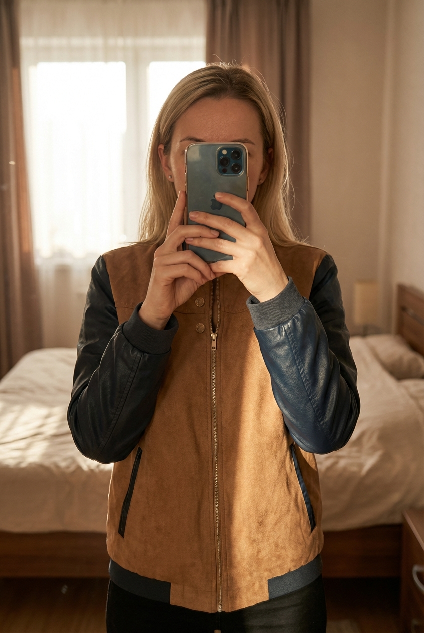 Blouson daim kenzarro S debout, face à la caméra, dans une chambre à la lumière douce, avec une lumière naturelle filtrant par la fenêtre.