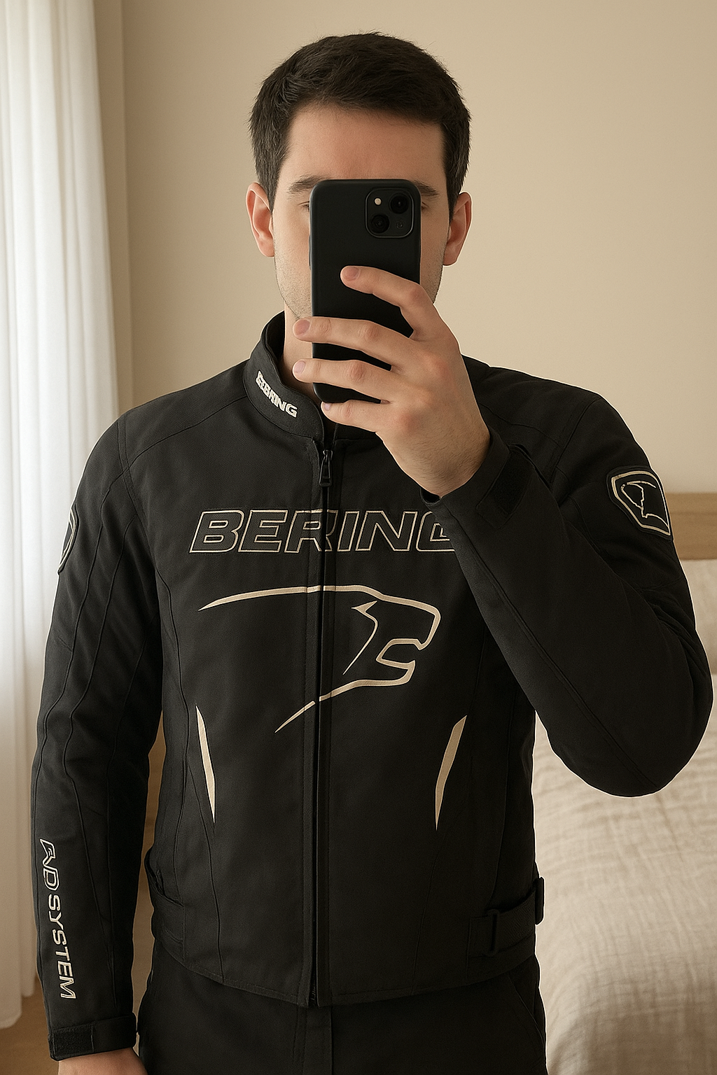 Blouson de moto debout, face à la caméra, dans une chambre à la lumière douce, avec une lumière naturelle filtrant par la fenêtre.