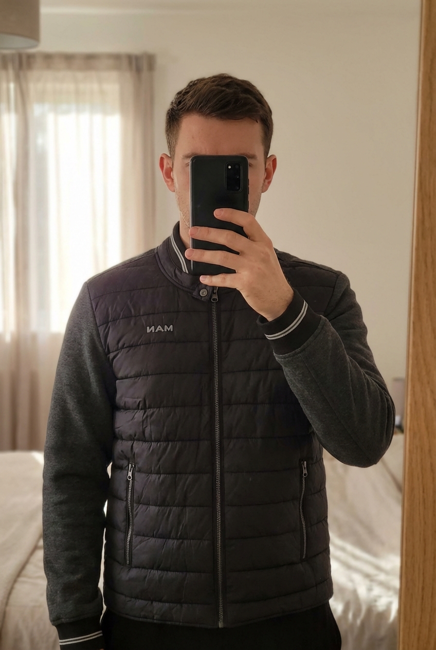 Blouson homme debout, face à la caméra, dans une chambre à la lumière douce, avec une lumière naturelle filtrant par la fenêtre.