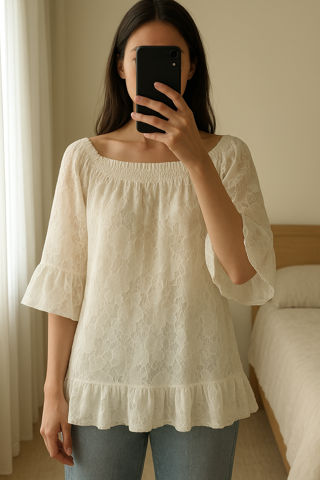 Blusa/Chamisa bianca in piedi, rivolto verso la fotocamera, in una camera da letto con luce soffusa e luce naturale che filtra dalla finestra.