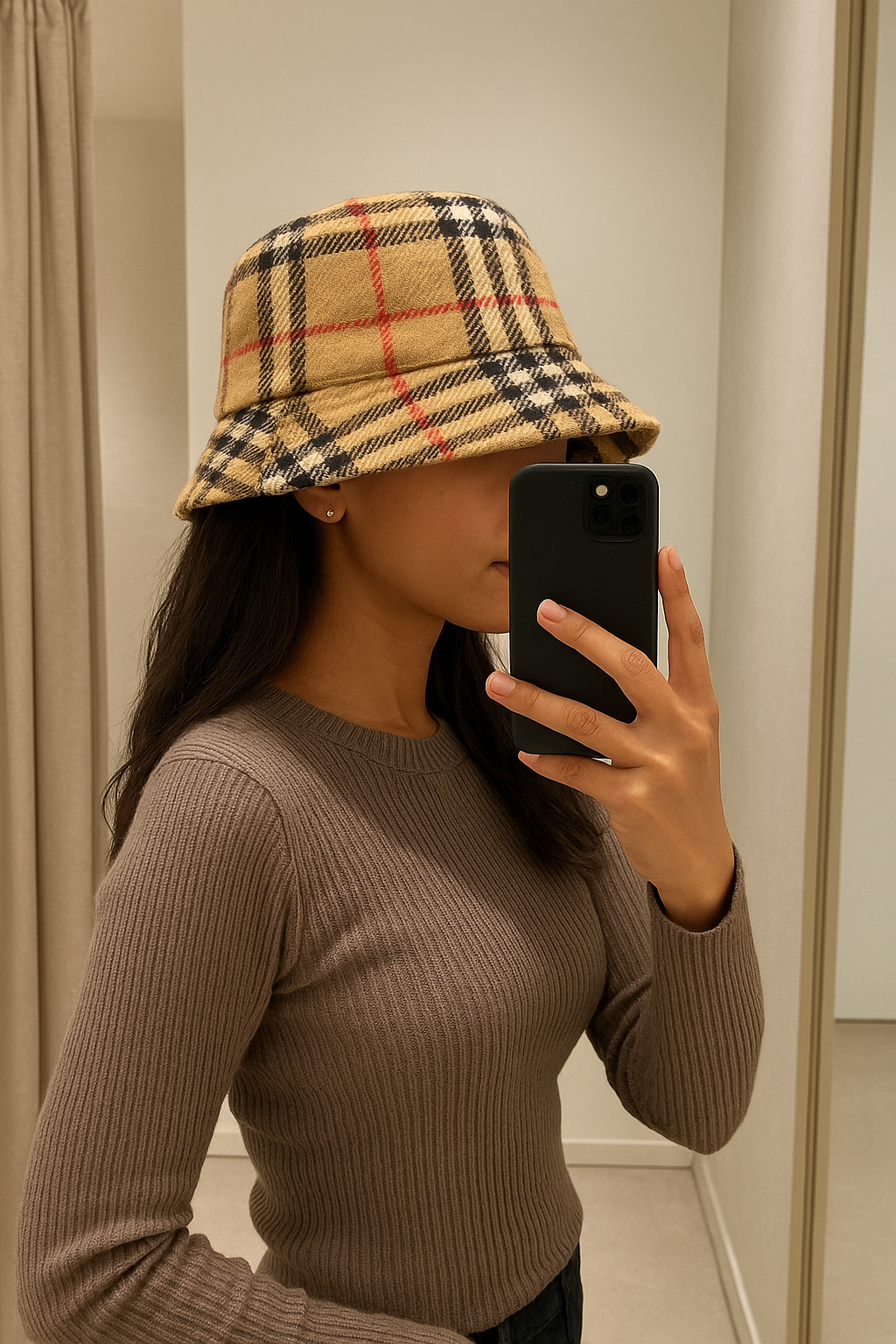 Une personne en Bob Burberry 🎀 cambrant légèrement le dos pour une pose dynamique, dans une cabine d’essayage de style boutique avec un miroir et une décoration neutre.