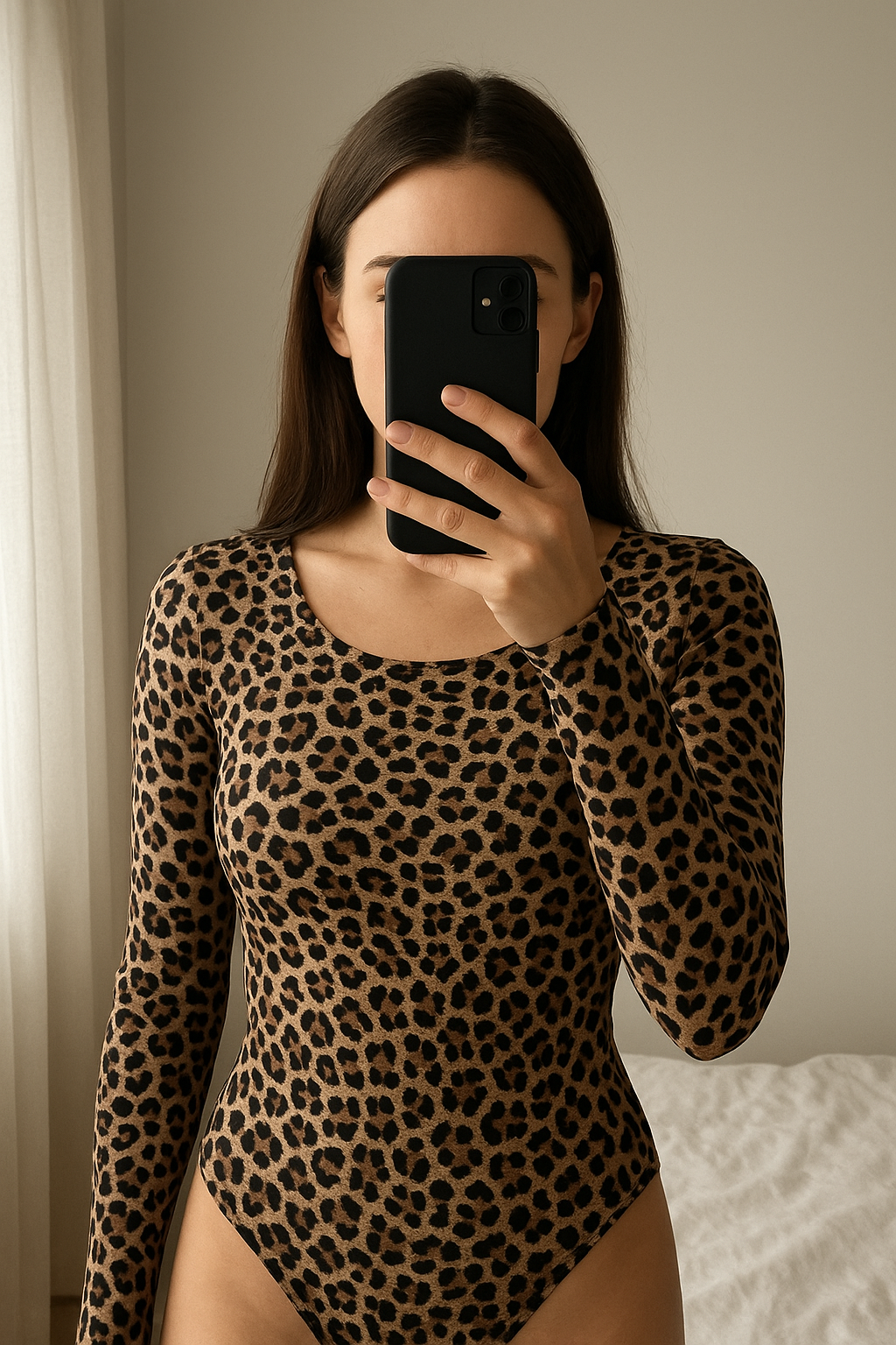 Body léopard debout, face à la caméra, dans une chambre à la lumière douce, avec une lumière naturelle filtrant par la fenêtre.