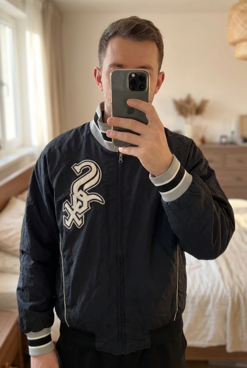 Bomber debout, face à la caméra, dans une chambre à la lumière douce, avec une lumière naturelle filtrant par la fenêtre.