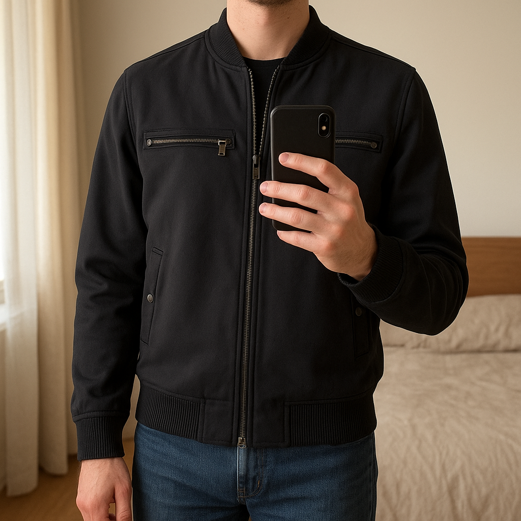 Bomber Zara man L - Giacca Zara man in piedi, rivolto verso la fotocamera, in una camera da letto con luce soffusa e luce naturale che filtra dalla finestra.