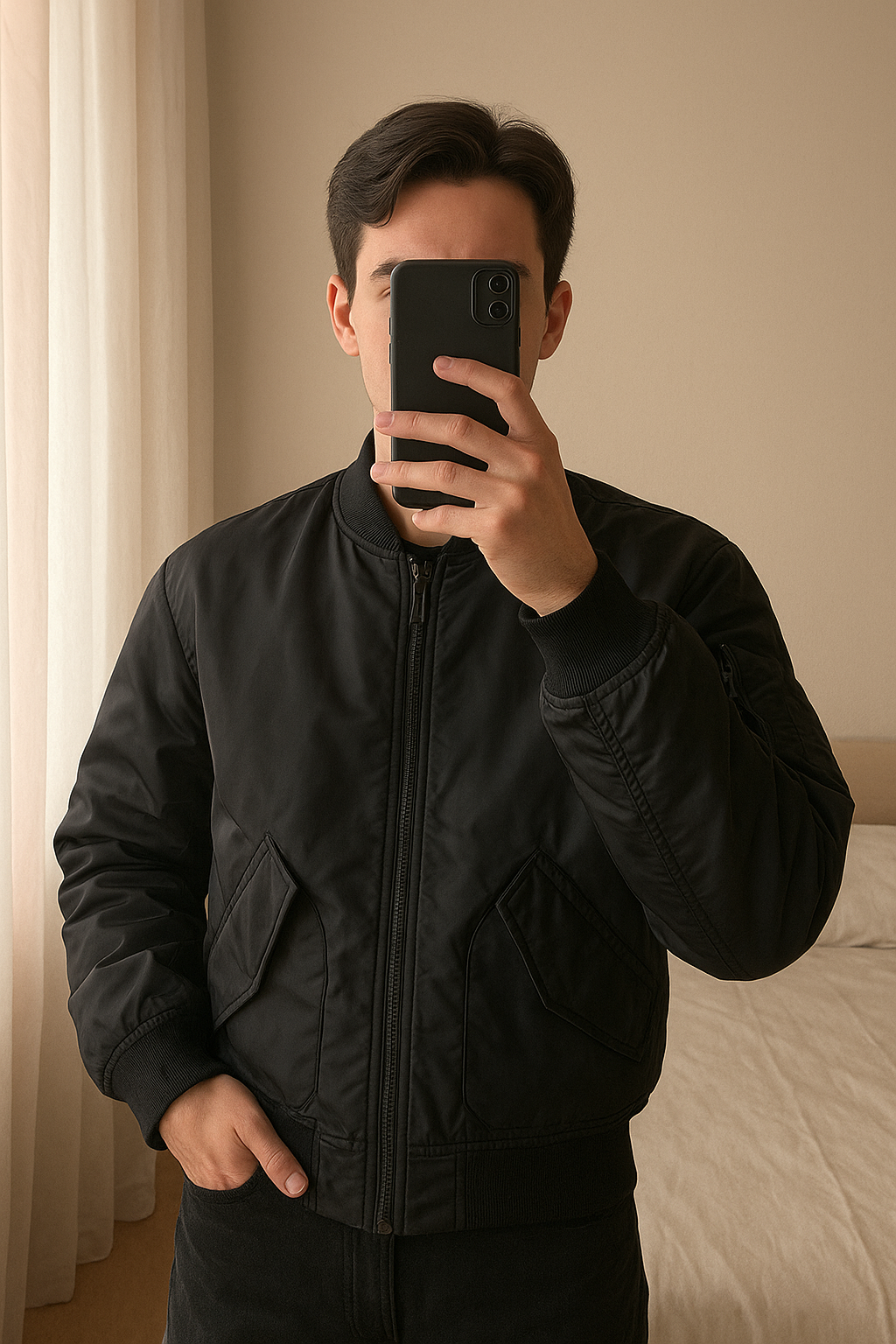 Bombers bershka taille M debout, face à la caméra, dans une chambre à la lumière douce, avec une lumière naturelle filtrant par la fenêtre.