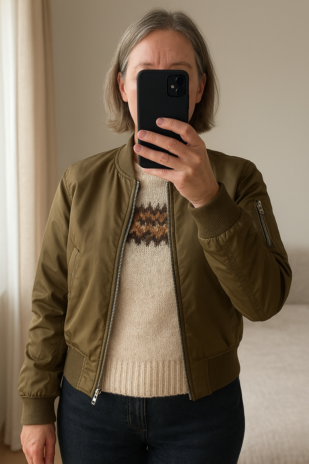 Bombers "Esprit" debout, face à la caméra, dans une chambre à la lumière douce, avec une lumière naturelle filtrant par la fenêtre.