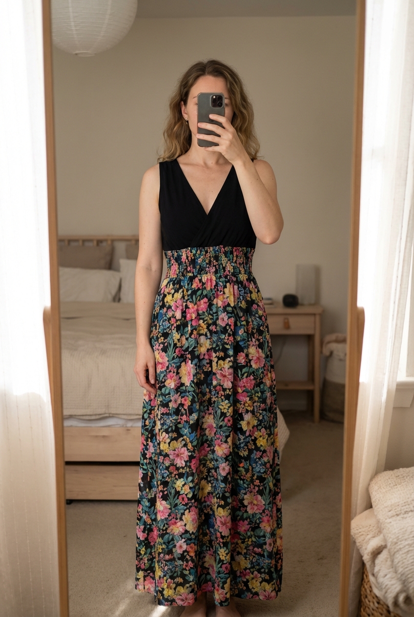 Boohoo long dress standing straight facing the camera, in a softly lit bedroom setting, with gentle natural light filtering through a window.