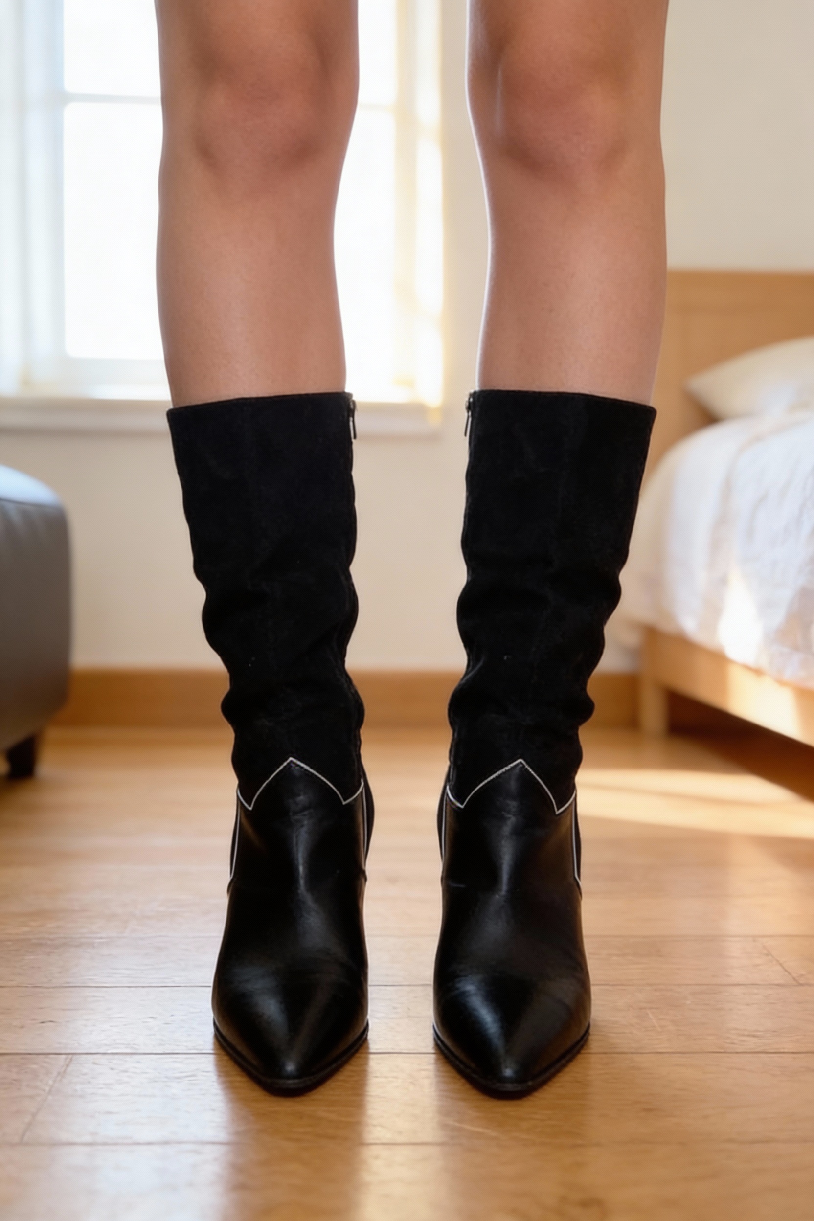 Bottes eram debout, face à la caméra, dans une chambre à la lumière douce, avec une lumière naturelle filtrant par la fenêtre.