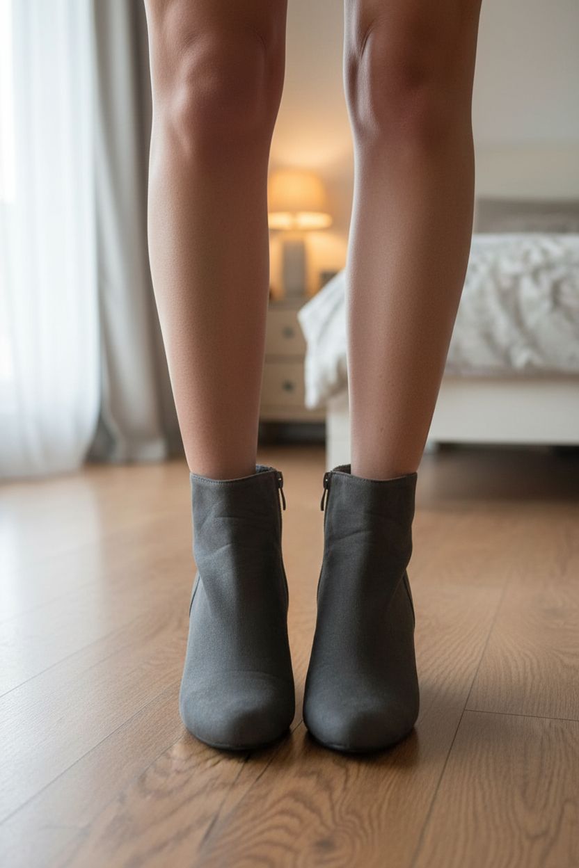 Bottine grise strass Pointure 37 debout, face à la caméra, dans une chambre à la lumière douce, avec une lumière naturelle filtrant par la fenêtre.