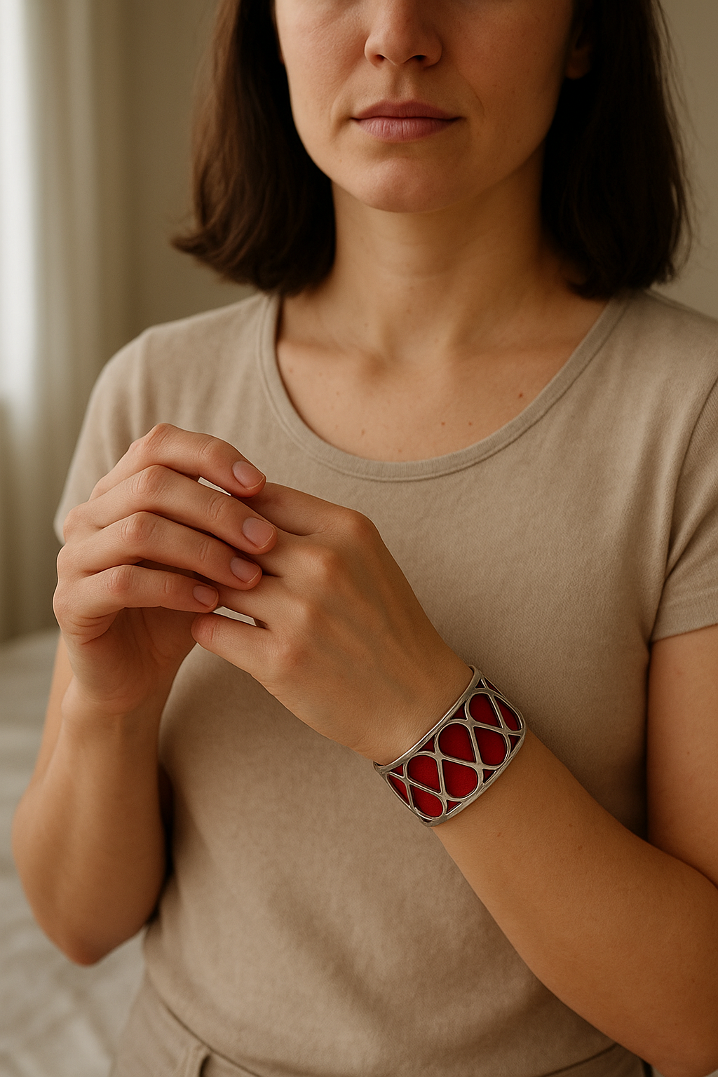 bracelet manchette Georgette debout, face à la caméra, dans une chambre à la lumière douce, avec une lumière naturelle filtrant par la fenêtre.