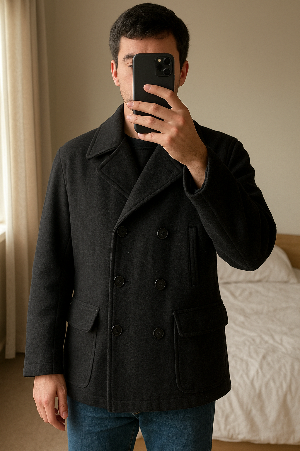 Caban homme debout, face à la caméra, dans une chambre à la lumière douce, avec une lumière naturelle filtrant par la fenêtre.