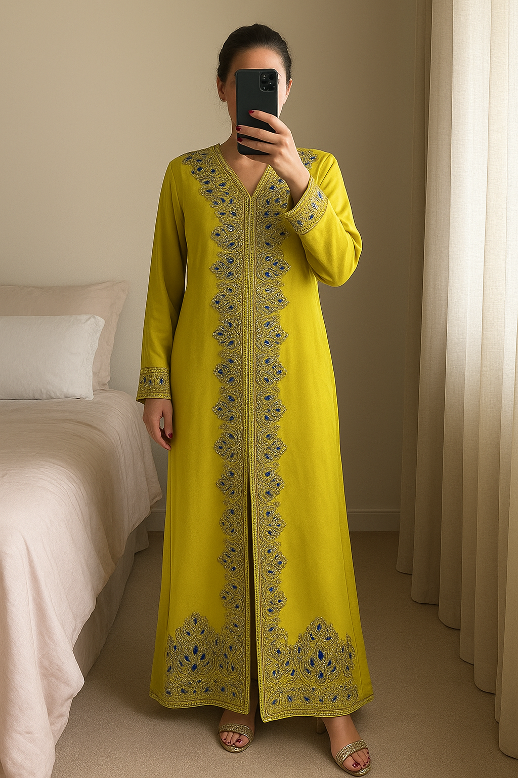 Caftan, robe orientale jaune anis détail bleu debout, face à la caméra, dans une chambre à la lumière douce, avec une lumière naturelle filtrant par la fenêtre.