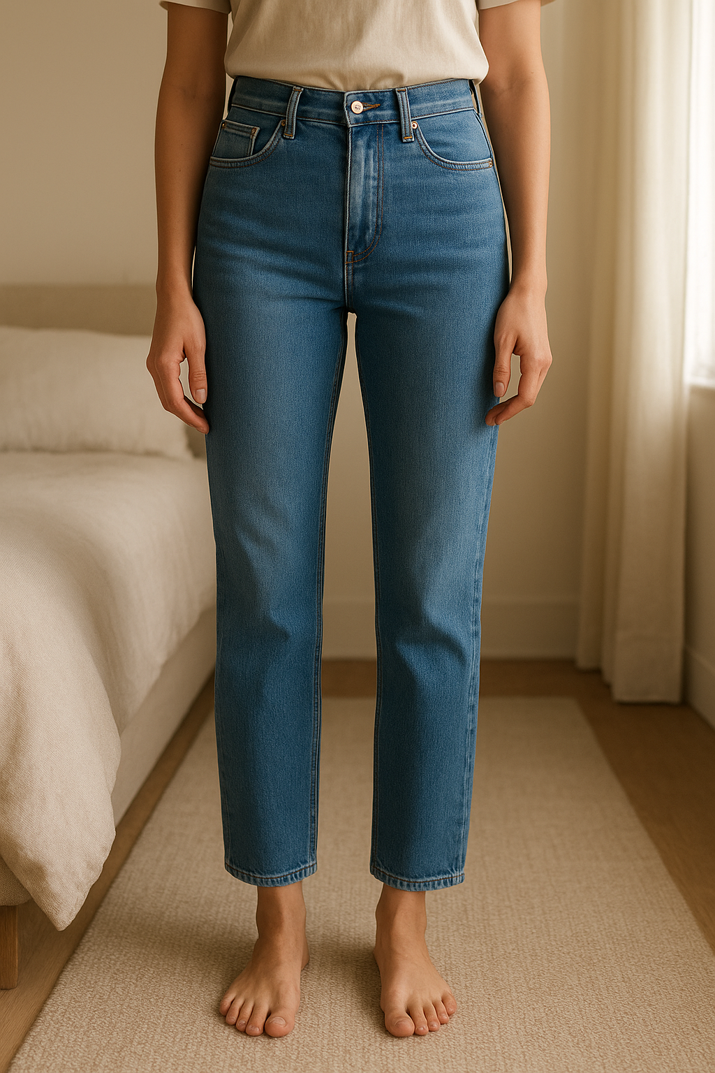 Calças de ganga tiffosi push up em pé, de frente para a câmera, em um quarto com iluminação suave e luz natural filtrando pela janela.