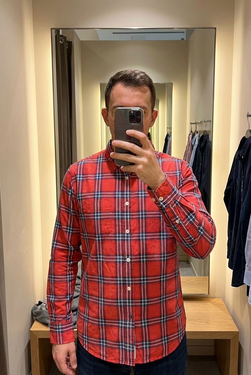 Una persona in Camicia a quadri da uomo – Taglia S Cod.3213 in piedi, rivolto verso la fotocamera, in un camerino in stile boutique con specchio e decorazioni neutre.