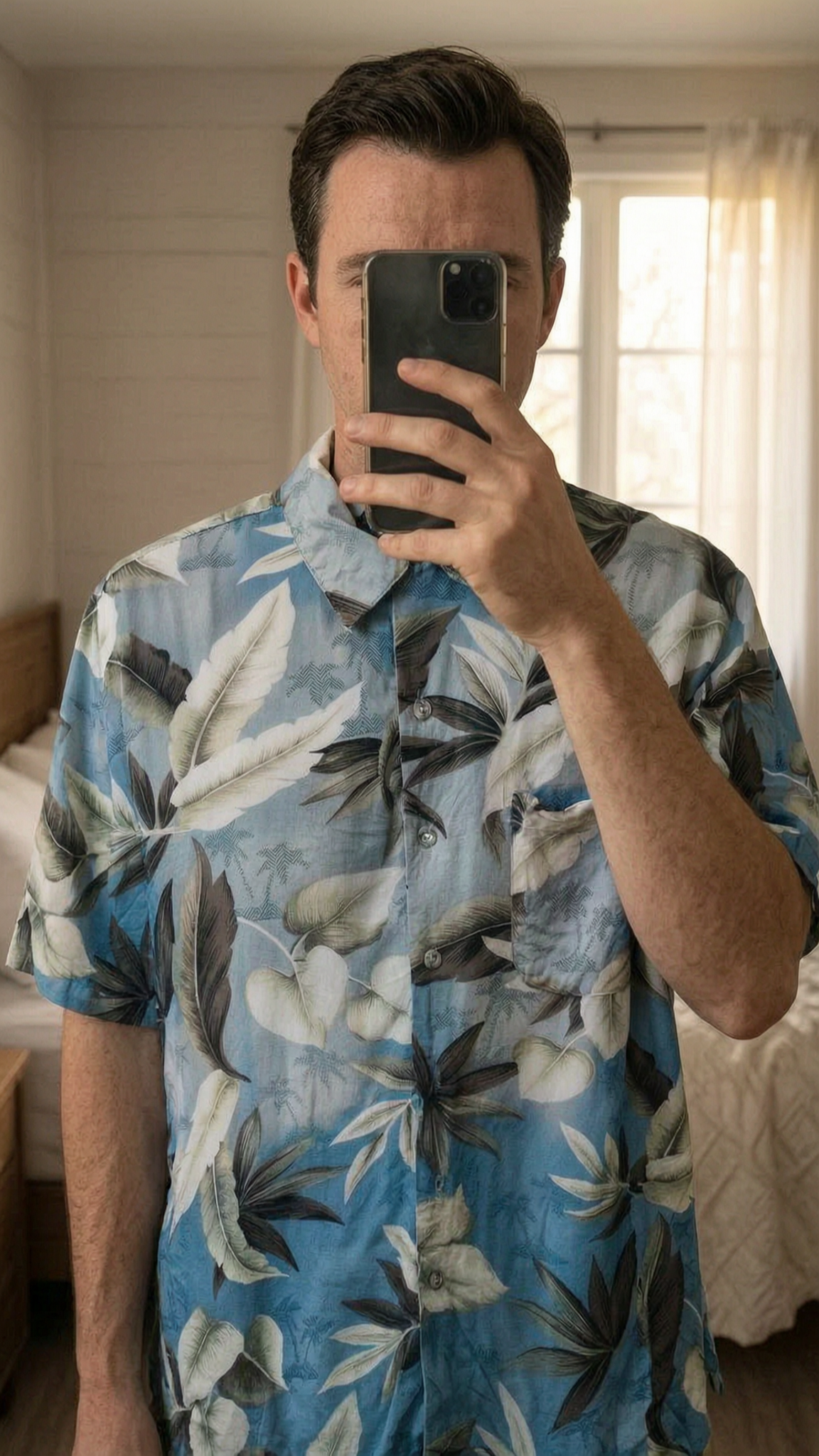Camicia hawaiana Caribbean Blues 🌺 in piedi, rivolto verso la fotocamera, in una camera da letto con luce soffusa e luce naturale che filtra dalla finestra.
