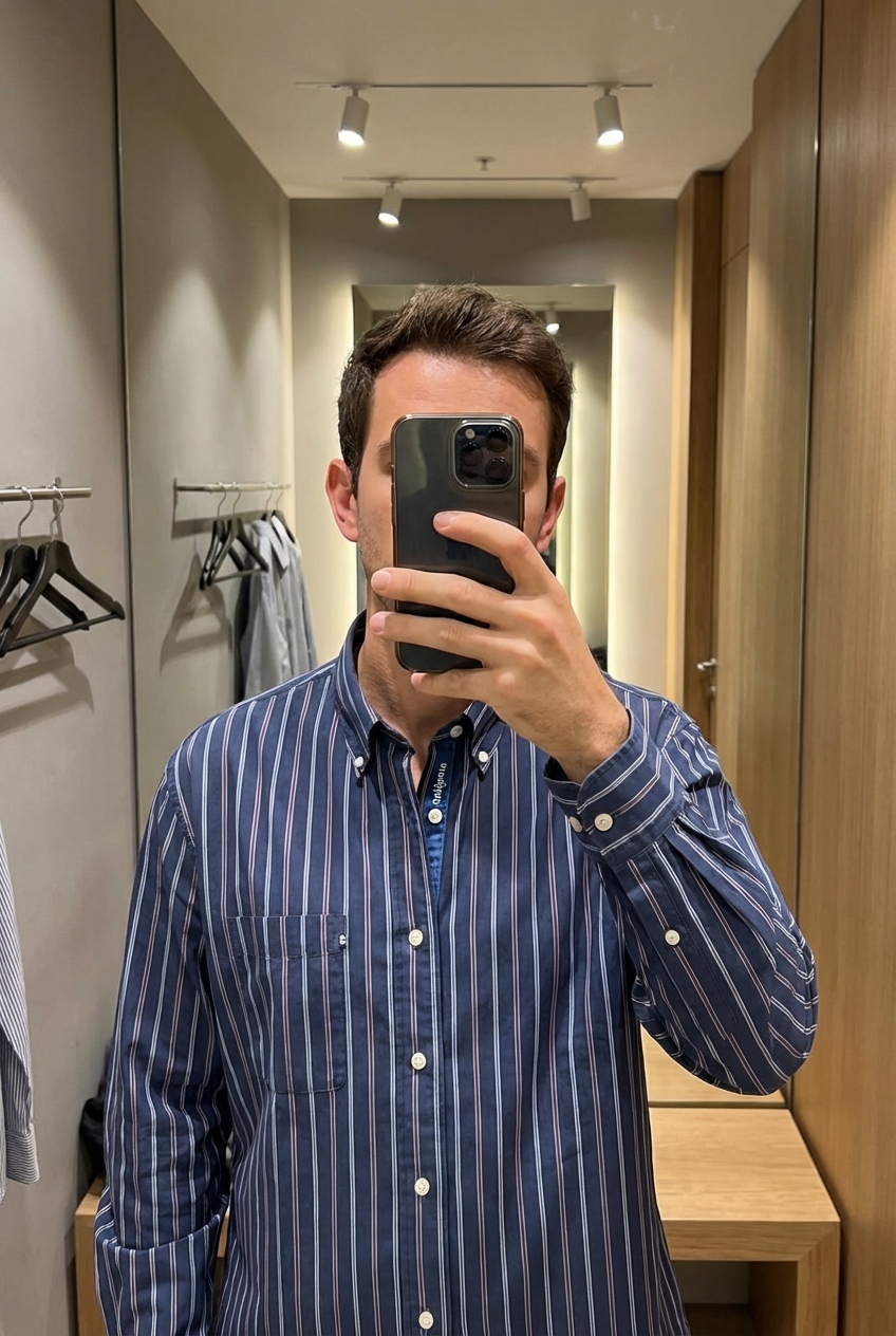 Una persona in Camicia uomo a righe – Taglia XXL Cod.3209 in piedi, rivolto verso la fotocamera, in un camerino in stile boutique con specchio e decorazioni neutre.