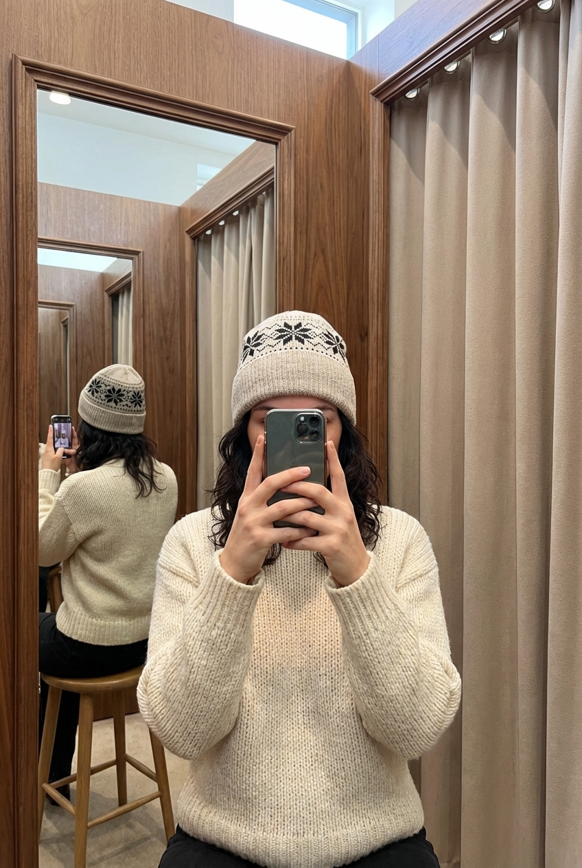 Una persona in Cappello in Maglia Jacquard – Eleganza Nordica & Stile Senza Tempo seduto su una sedia alta, con postura rilassata, in un camerino in stile boutique con specchio e decorazioni neutre.