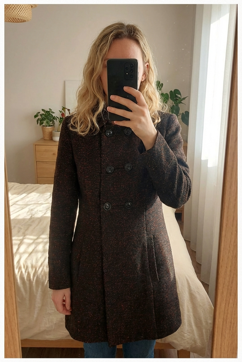 🧥 Cappotto Camaïeu doppiopetto – elegante e originale | IT 42 in piedi, rivolto verso la fotocamera, in una camera da letto con luce soffusa e luce naturale che filtra dalla finestra.