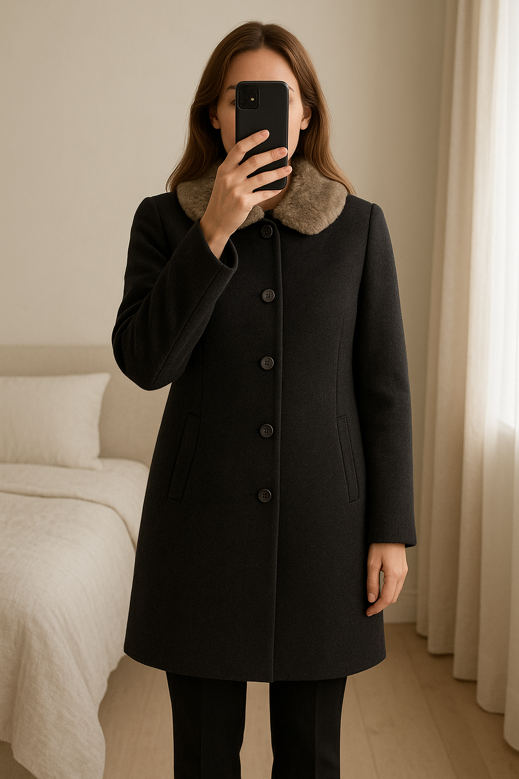 Cappotto Donna Elegante in Lana – Taglia 44 | Linee Raffinate & Stile Senza Tempo Cod.3266 in piedi, rivolto verso la fotocamera, in una camera da letto con luce soffusa e luce naturale che filtra dalla finestra.