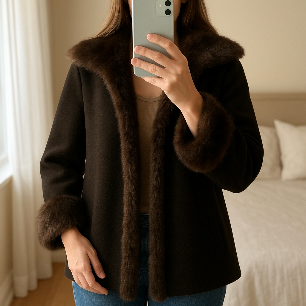 Cappotto donna in lana con bordo in pelliccia sintetica – Made in Italy, taglia L in piedi, rivolto verso la fotocamera, in una camera da letto con luce soffusa e luce naturale che filtra dalla finestra.