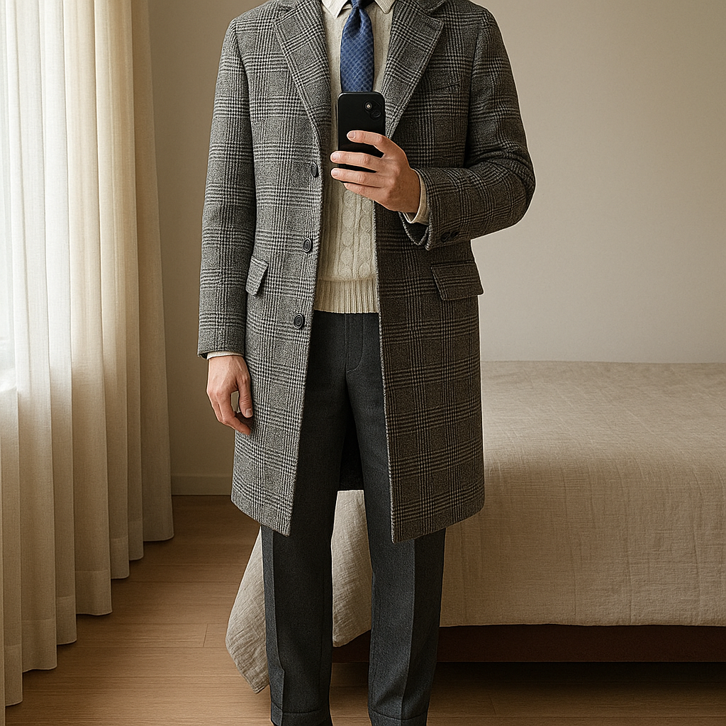 Cappotto Principe di Galles Grigio in Lana – Taglie 48 e 54 – Eleganza e Stile in piedi, rivolto verso la fotocamera, in una camera da letto con luce soffusa e luce naturale che filtra dalla finestra.