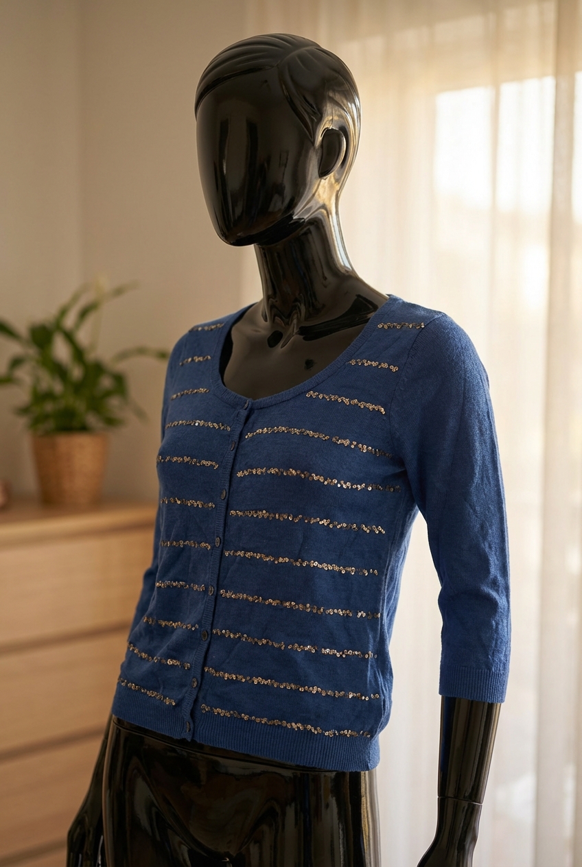 un mannequin noir brillant en plastique, sans traits du visage en Cardigan bleu nuit à paillettes Camaïeu cambrant légèrement le dos pour une pose dynamique, dans une chambre à la lumière douce, avec une lumière naturelle filtrant par la fenêtre.