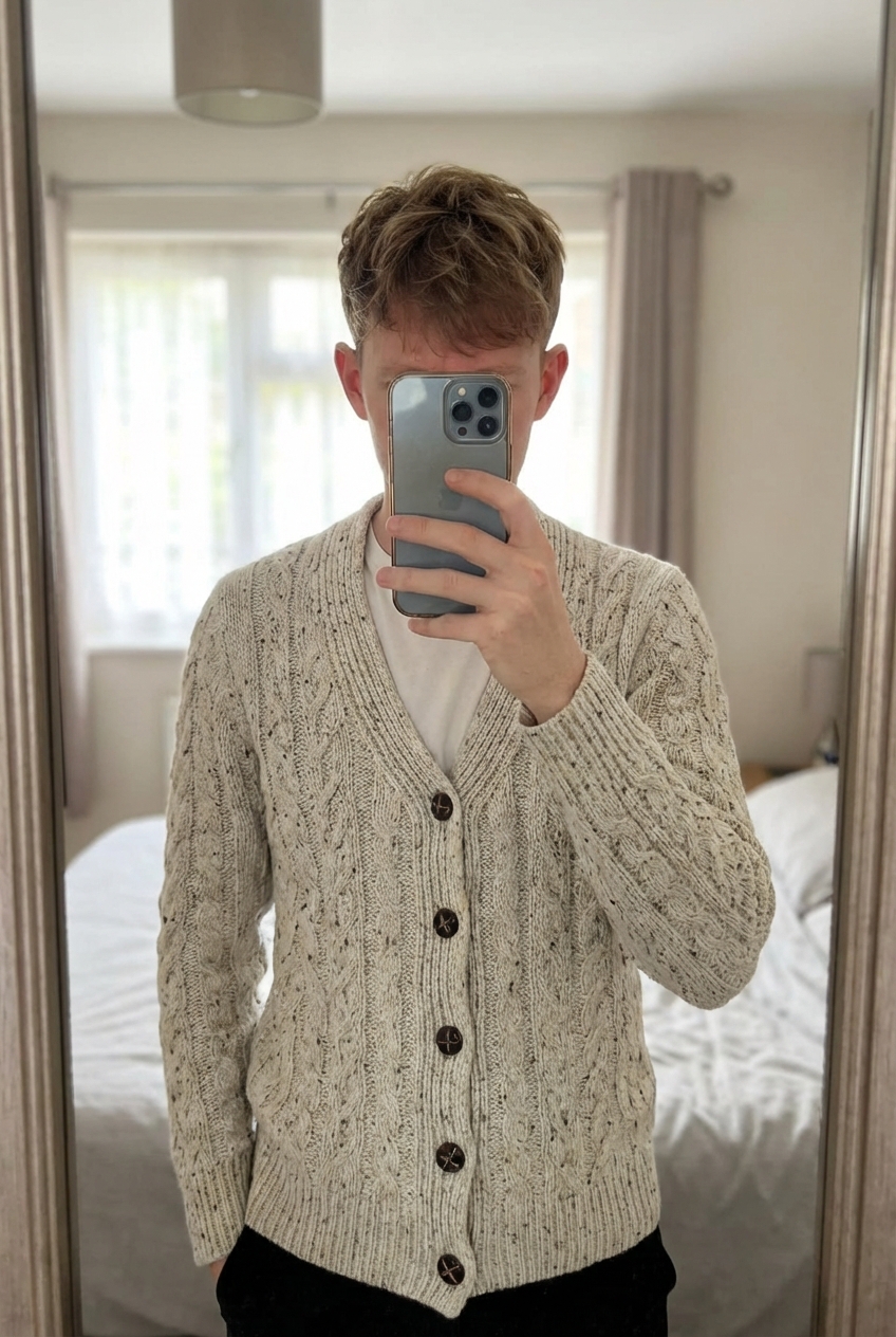 Une personne en Cardigan Fait Main Torsadé Aran Wool Sweater Laine et viscose Blanc Crème Aran Craft XXS debout, face à la caméra, avec une silhouette fine, dans une chambre à la lumière douce, avec une lumière naturelle filtrant par la fenêtre.