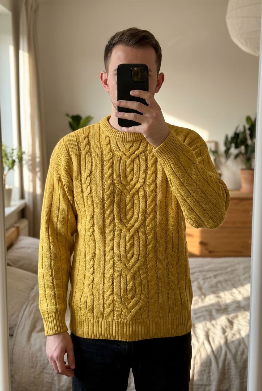Cardigan Fait Main Tricot Aran Sweater 100% Acrylique Jaune Aran Craft M debout, face à la caméra, dans une chambre à la lumière douce, avec une lumière naturelle filtrant par la fenêtre.
