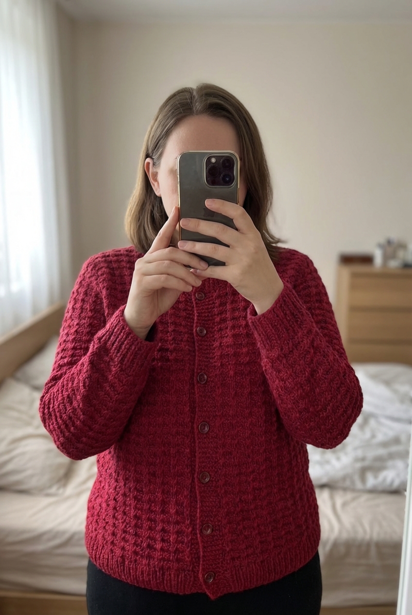 Une personne en Cardigan Fait Main Tricot Aran Wool Sweater 100% Laine Rouge Bordeaux Aran Craft XL debout, face à la caméra, avec une silhouette légèrement plus ronde, dans une chambre à la lumière douce, avec une lumière naturelle filtrant par la fenêtre.