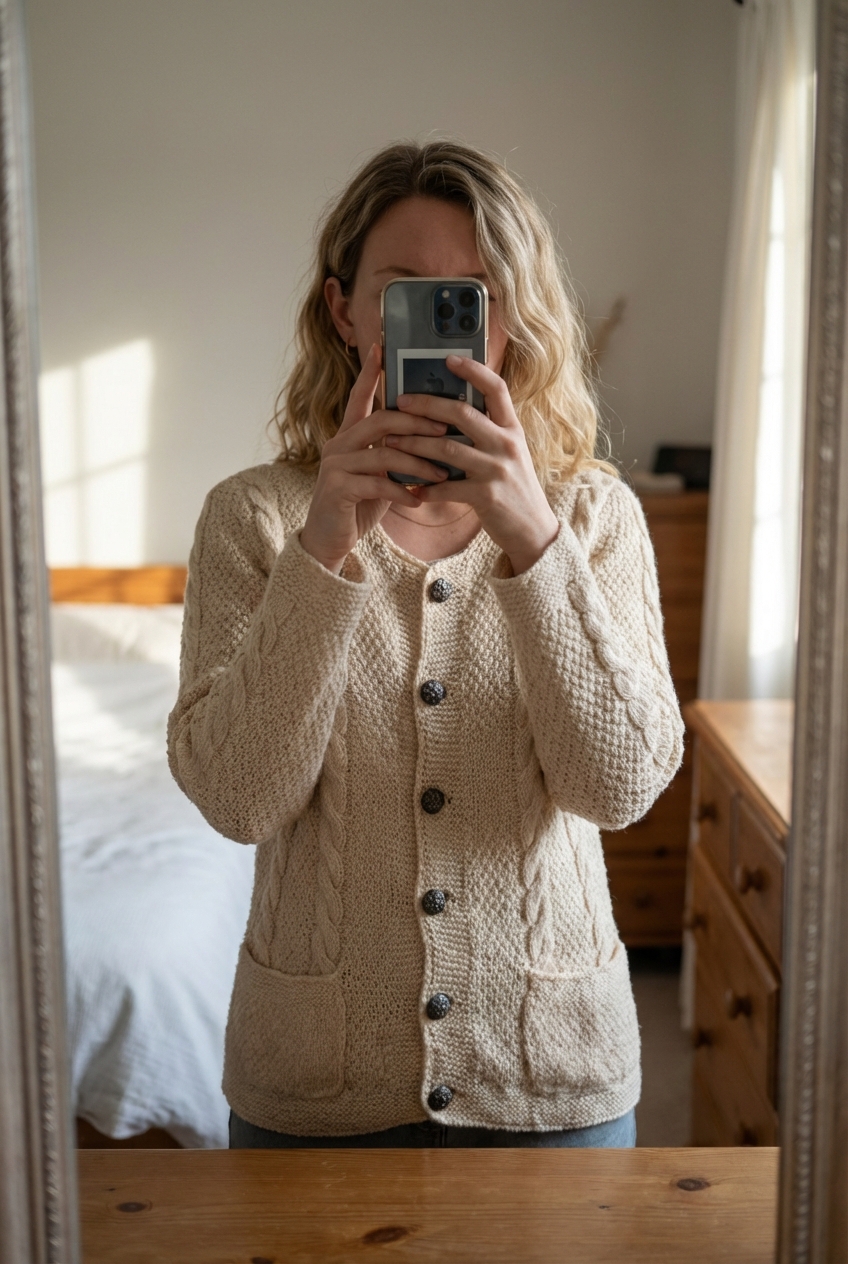 Cardigan Fait Main Tricot Aran Wool Sweater 100% mix Laine Beige Crème Aran Craft L debout, face à la caméra, dans une chambre à la lumière douce, avec une lumière naturelle filtrant par la fenêtre.