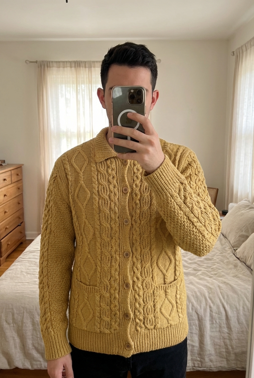 Cardigan Handknit Torsadé Aran Wool Sweater Mix Laine Jaune Moutarde Aran Craft L debout, face à la caméra, dans une chambre à la lumière douce, avec une lumière naturelle filtrant par la fenêtre.