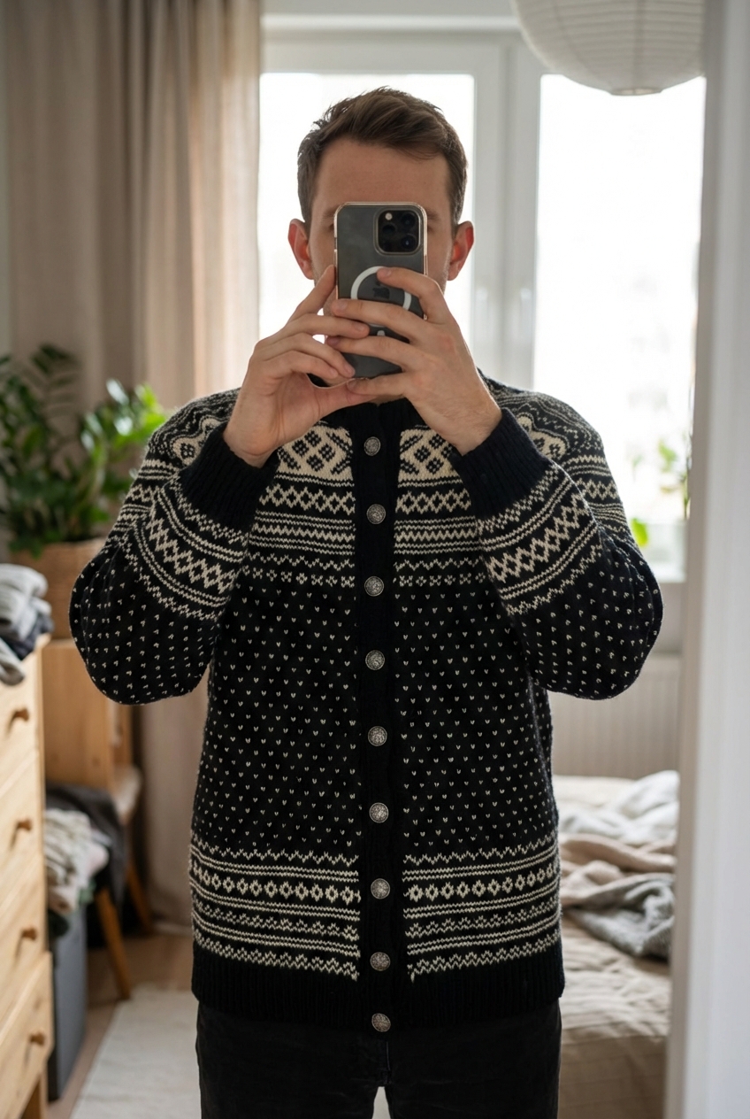 Cardigan Nordique Norvegian Sweater Fait Main Tricot Norway Pewter clasp 100% Laine Noir M/L debout, face à la caméra, dans une chambre à la lumière douce, avec une lumière naturelle filtrant par la fenêtre.