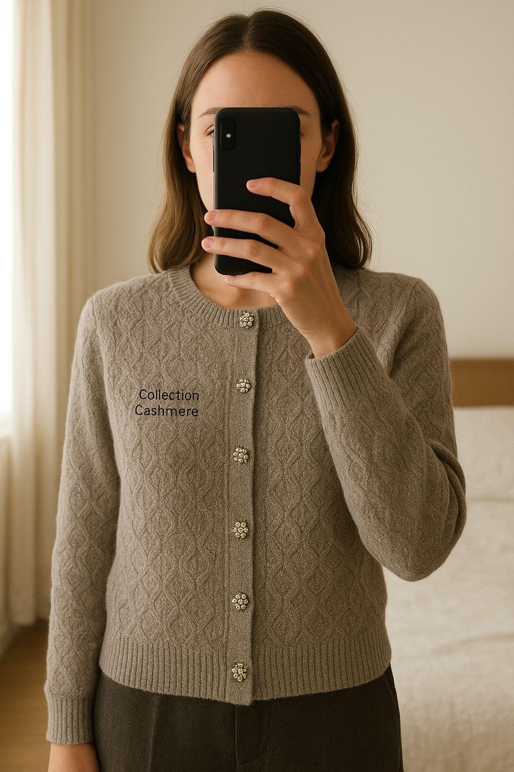 Cardigan vintage beige taupe M 45%cachemire debout, face à la caméra, dans une chambre à la lumière douce, avec une lumière naturelle filtrant par la fenêtre.