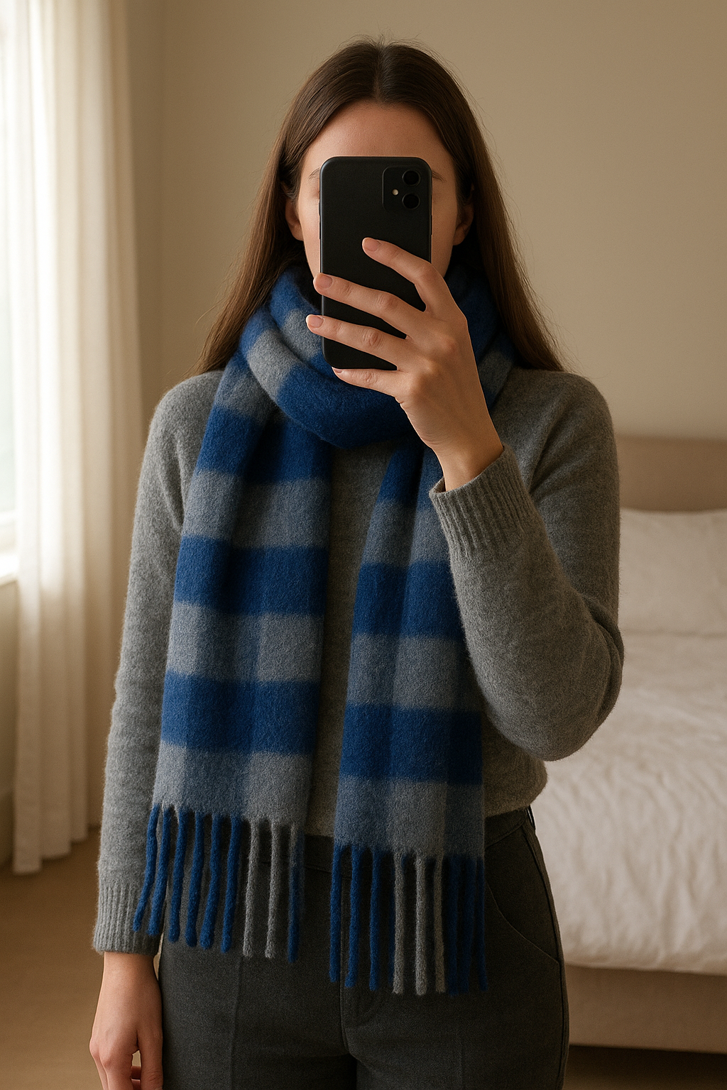 Écharpe debout, face à la caméra, dans une chambre à la lumière douce, avec une lumière naturelle filtrant par la fenêtre.