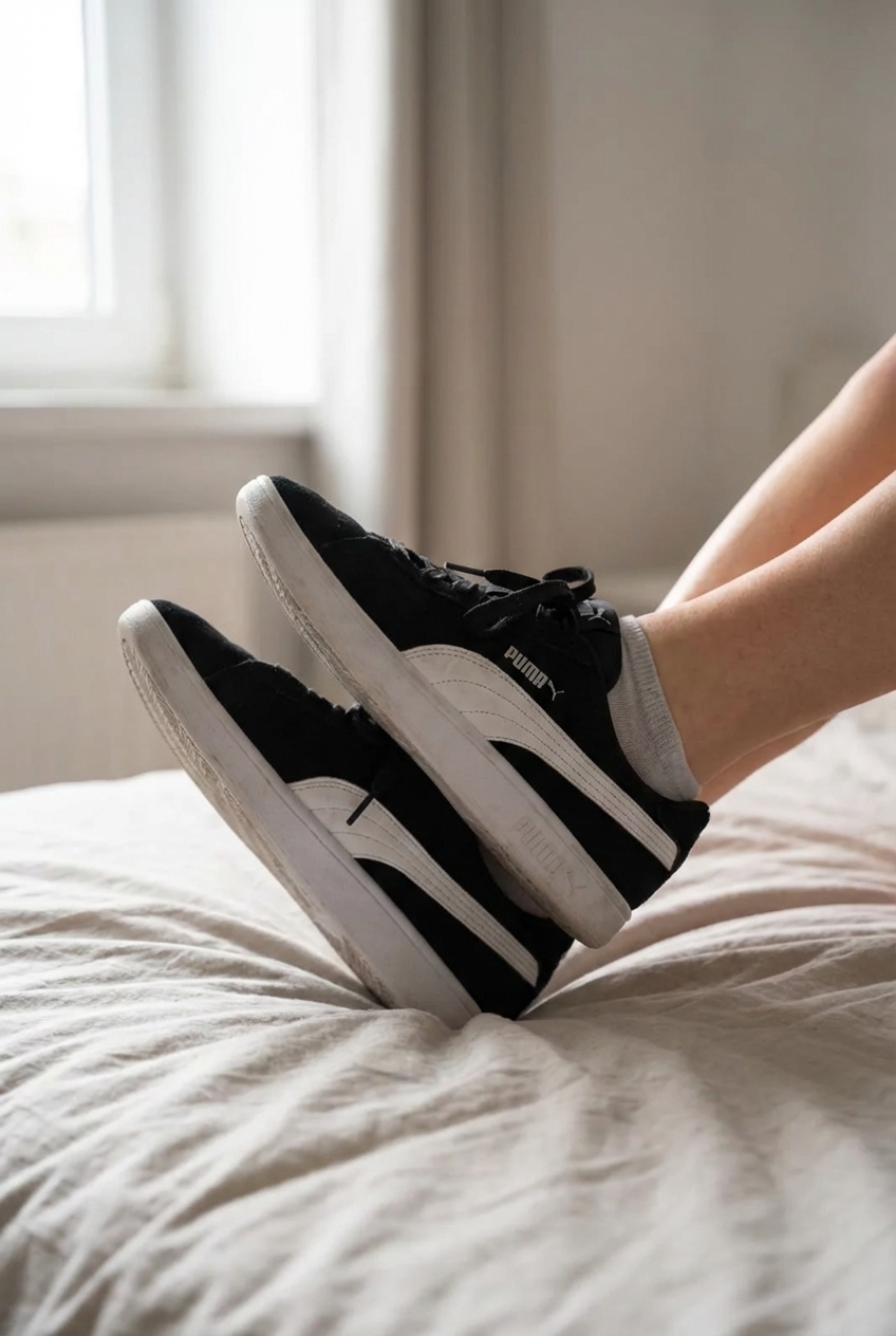 Una persona in Chaussures baskets puma femme 39 - scarpe puma donna 39 inarcando leggermente la schiena per una posa dinamica, in una camera da letto con luce soffusa e luce naturale che filtra dalla finestra.