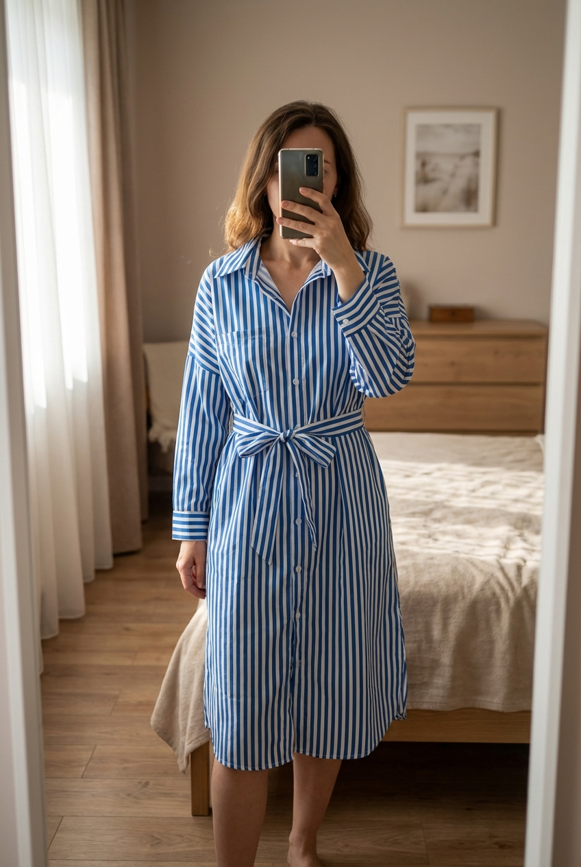 Chemise debout, face à la caméra, dans une chambre à la lumière douce, avec une lumière naturelle filtrant par la fenêtre.
