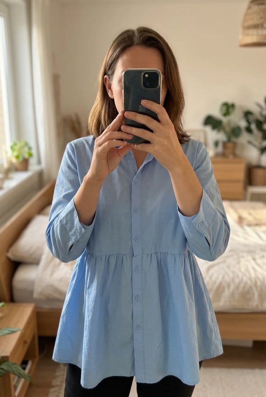 Une personne en Chemise debout, face à la caméra, dans une chambre à la lumière douce, avec une lumière naturelle filtrant par la fenêtre.
