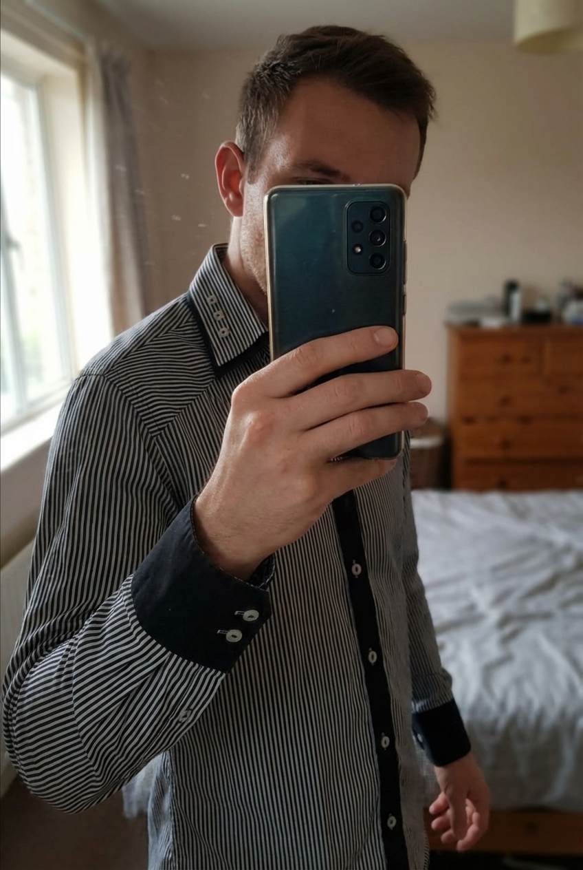 Chemise a Rayures Gris debout, face à la caméra, dans une chambre à la lumière douce, avec une lumière naturelle filtrant par la fenêtre.