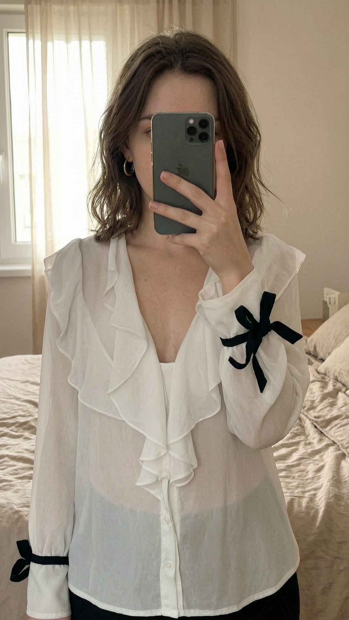 Chemise blanche élégante femme S debout, face à la caméra, dans une chambre à la lumière douce, avec une lumière naturelle filtrant par la fenêtre.